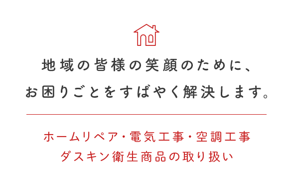 これら幅広いサービス内容で、地域のお客様の笑顔のために、お困りごとをすばやく解決いたします。是非お気軽にご相談ください。